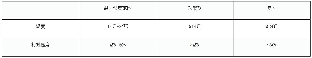 國家檔案局《檔案庫房技術管理暫行規定》對檔案庫房(也適用于機關檔案室)溫濕度要求做了如下明確界定:檔案庫房(含膠片室、磁帶室)的溫度應控制在14~24℃,有設備的庫房日變化幅度不超過2℃,相對濕度應控制在45~60%,有設備的庫房日變化幅度不超過±5%。